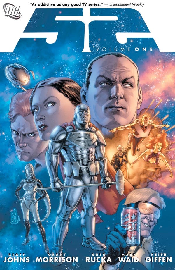 52, vol. 1. Written by Geoff Johns, Grant Morrison, Greg Rucka, and Mark Waid, with layouts by Keith Giffen, pencils by Eddy Barrows, Chris Batista, Joe Bennett, Ken Lashley, Shawn Moll, and Todd Nauck, inks by Marlo Alquiza, Draxhall, Jack Jadson, Ruy José Tom Nguyen, Jimmy Palmiotti, and Rob Stull, colors by David Baron and Alex Sinclair, and letters by Phil Balsman, Pat Brosseau, Jared K. Fletcher, Travis Lanham, Rob Leigh, and Nick J. Napolitano. Phew! 52 was a weekly comic published by DC, hence the paragraph of creators. I'm historically not an expert in DC, so this might be diving in the deep end, something I am not scared to do anymore because I'm a grown up.