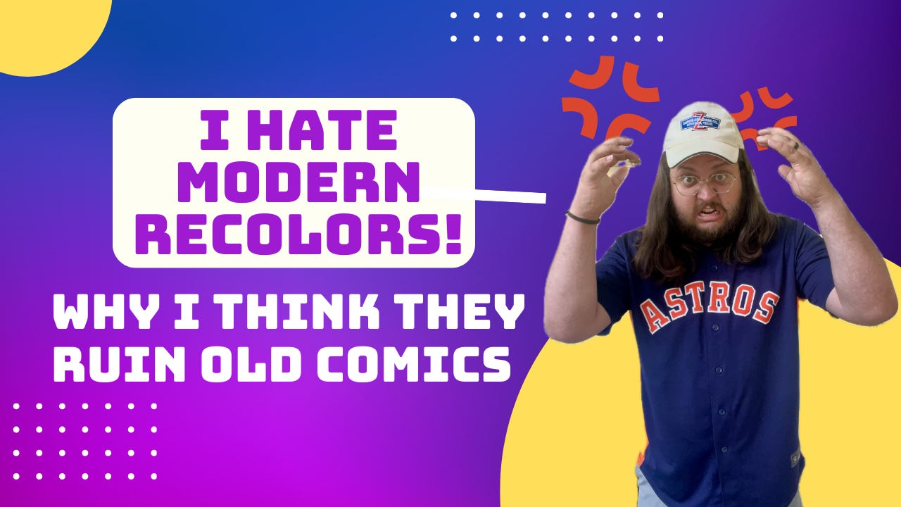 Welcome to Imprinted Image, my weekly comics newsletter that has been coming out closer to bi-weekly, and perhaps might stay that way, if y'all have thoughts. If this is your first time, welcome! Most every week, I send out this post with a summary of what else I did this week, a collection links to comics news items I found interesting, and a rough draft essay on whatever topic I'd like. This week, I rant about a pet peeve that bothers me and seemingly very few other comic book fans: unfaithful comic book recoloring.