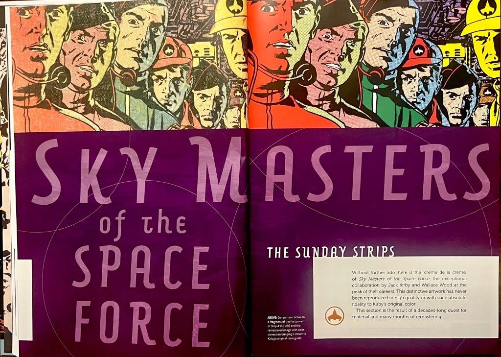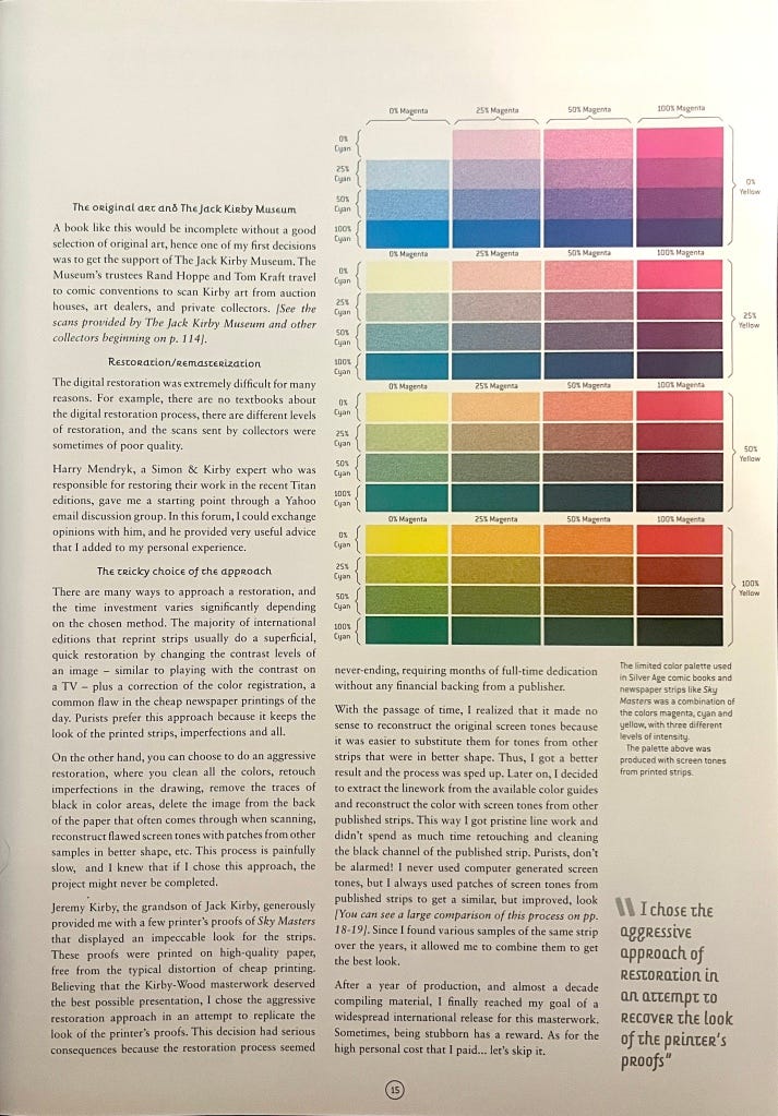 As a positive example of how to do this kind of restoration right, look no further than the SKY MASTERS OF THE SPACE FORCE Complete Sunday Strips that I received in the mail last week. Restorer Ferran Delgado writes up in detail his process, which involves recoloring using the actual colors available to newspaper comics at the time. While I'm sure you could still quibble with some of the final results, as Delgado admits (often older colorists would use garish and saturated colors in the mock-ups knowing that they would be muted on the page given printing and paper limitations of the time), the final result looks so much better than other modern recolorings.