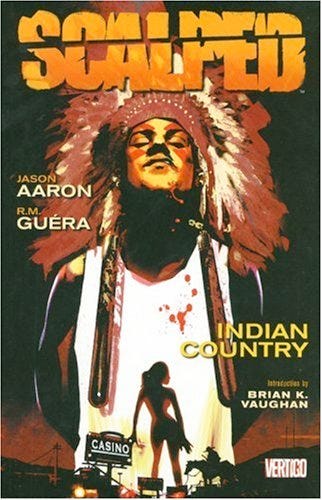 SCALPED vol. 1 written by Jason Aaron, drawn by R. M. Guerra, colored by Lee Loughridge, and lettered by Phil Balsman. This is the book that put Jason Aaron on the map, and I have no idea what it is about, other than involving Native Americans. I think it might be one of those Vertigo-style re-imaginings of a classic DC character.