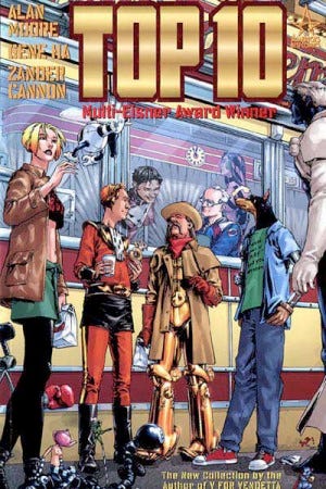 TOP 10 vol. 1 written by Alan Moore, layouts by Zander Cannon, final art by Gene Ha, colored by Wildstorm FX and lettered by Todd Klein. To be honest, why haven't I read this already? I love all of the talent involved here. Get your act together, Spike Stonehand.