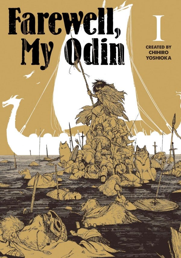 FAREWELL, MY ODIN vol. 1 by Chihiro Yoshioka, translated by Cynthia Caraturo and relettered in English by Bensidi Ayoub. This is a very new manga that I pulled because 1, it looked interesting, and 2, was endorsed by the creator of another popular Viking manga, VINLAND SAGA.