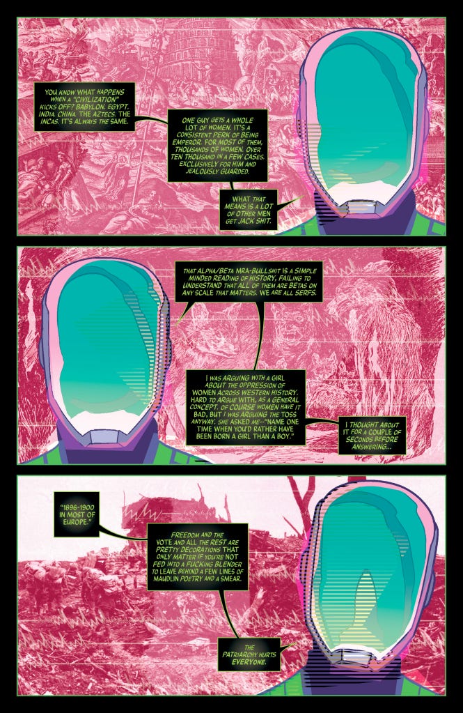 Hoo boy, this is quite the remix page. It's almost a recap of the series thus far, exploding out of Woden's brain like blood splatter. His head is the same head used the previous two pages.