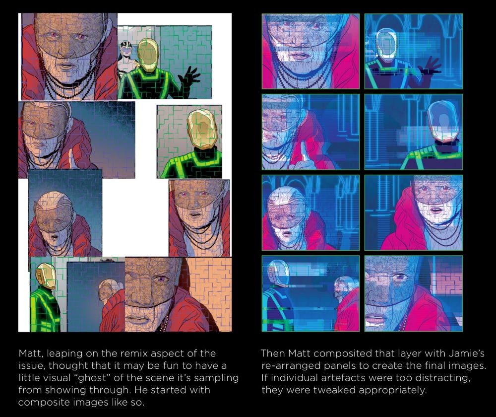 These don't really fit anywhere, as they have to do with the process of constructing the whole issue. But, in the collected editions, the team shares some behind-the-scenes notes on the construction of this issue.