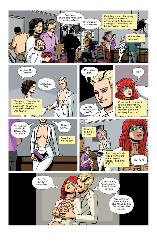 These two pages are actually from SEX CRIMINALS by Matt Fraction and Chip Zdarsky, issue 9, page 14-16. There, a character is acting in a porn parody of THE WICKED + THE DIVINE. Instead of usual colorer Matt Wilson, these pages were colored by series flatter Dee Cunniffe.