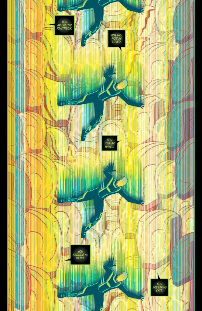 This whole page draws from issue 5. Gillen insisted on using Impact font for the fake dialog. This ties it into the internet meme culture, another form of remixing. It also brings back the theme of tarnishing the gods by not taking them seriously. They are punchlines, image macros to be shared and forgotten.