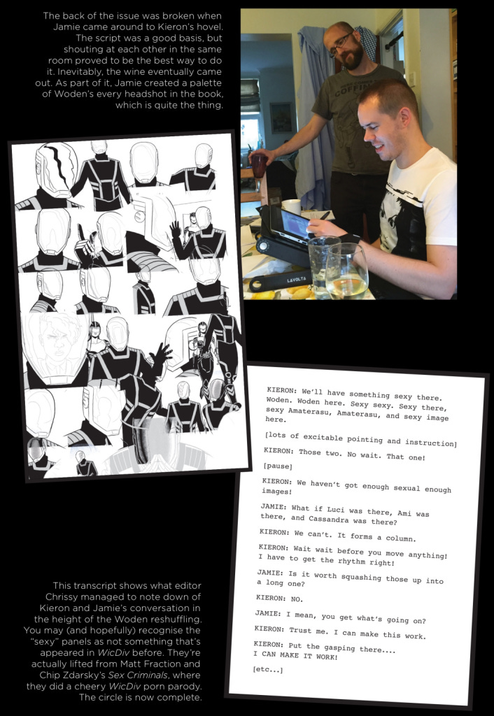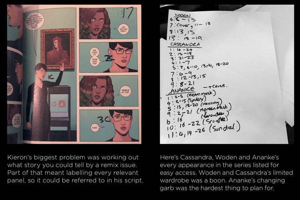 Gillen basically did what I did in reverse, finding every single panel he could use for the story and catalogued them for ease of use in sampling. He notes that using Cassandra was easy because she almost always wears the same all-black outift. The same works for Woden, whose obscured face means he can be reused even if the original emotions don't match up 100%. The difficulty came with how much they had to use Ananke. The solution they arrived at was that each scene in issue 14 would use an Ananke from a different issue.